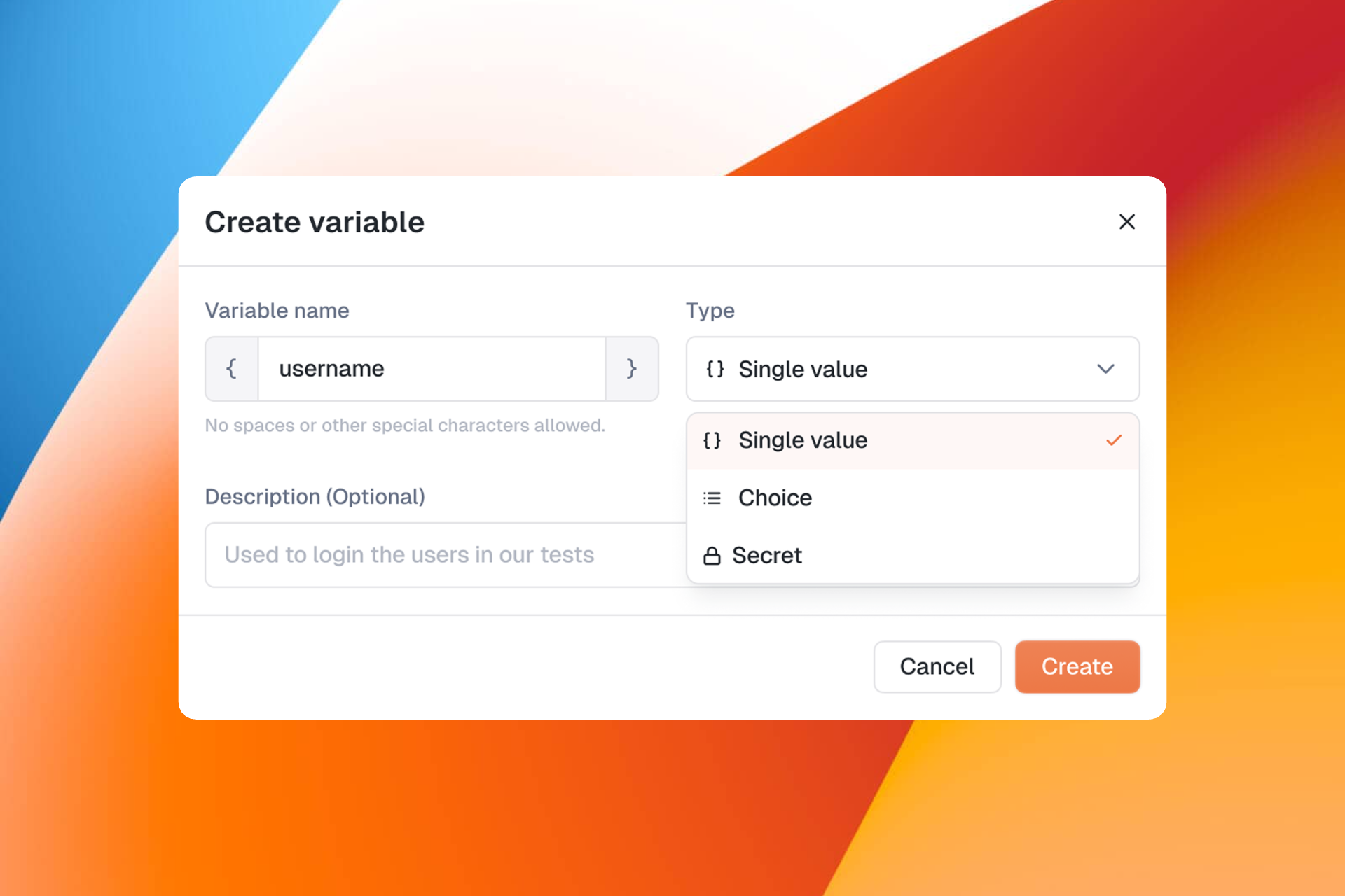Insert variables and secrets directly inside step inputs, assertions and conditions, making tests easier to maintain and adapt.